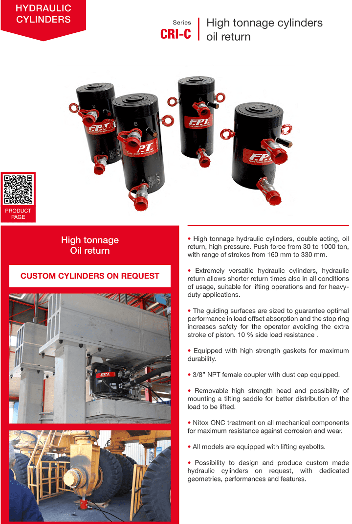 - Để nâng các tải trọng cỡ lớn, kích thước dài và rộng, có phân bố tải trọng không đồng đều, thường chọn giải pháp phối 1 bơm cho nhiều kích thủy lực 2 chiều FPT CRI-C-50/50, hoạt động đồng thời, thay vì chỉ sử dụng một vài chiếc kích cỡ lớn.