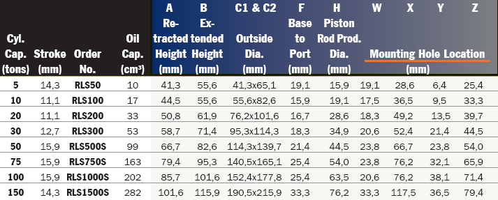 - Kích thủy lực RLS200 có chiều cao tĩnh ban đầu A = 50.8 mm, tiết diện kích C1 x C2 = 76.2 x 101.6 mm, đường kình xylanh H = 28.6 mm, trọng lượng: 2.5 kg.