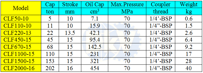 - Kích thủy lực Rehobot CLF1500-15, Rehobot low hydraulic jack CLF50-10 là loại kích thủy lực 1 chiều dạng mỏng, có sức nâng max: 153 tấn, hành trình max: 15 mm, áp hoạt động < 700 bar, chuyên dùng trong nâng hạ công nghiệp.
