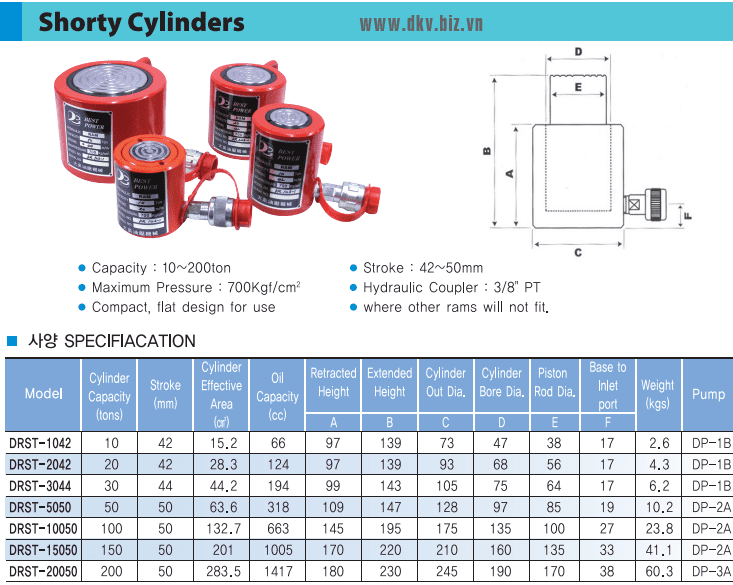 - Kích thủy lực ngắn Best Power DRST-5050, con đội thủy lực ngắn Best Power DRST-5050, Best Power short hydraulic jack DRST-5050: thuộc dòng sản phẩm kích thủy lực ngắn, 1 chiều có sức nâng max: 50 tấn, hành trình max: 44 mm, hoạt động ở áp < 700 bar.
