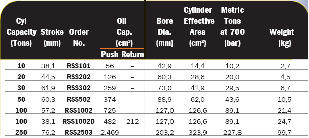 - Kích thủy lực Power Team RSS101, con đội thủy lực Power Team RSS101, Power Team hydraulic jack RSS101: là loại kích thủy lực 1 chiều, dạng ngắn, vỏ thép, có sức nâng max: 10 tấn, hành trình max: 38.1 mm, áp họat động < 700 bar (10.000 psi).