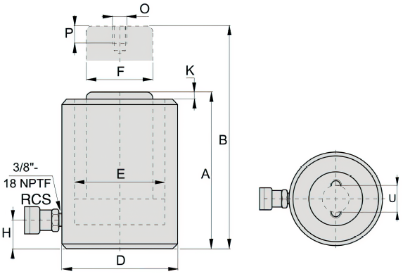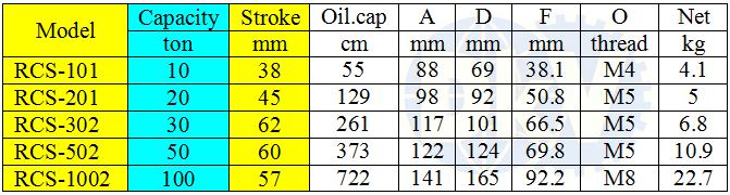 - Kích thủy lực RCS-101 có chiều cao tĩnh ban đầu A = 88 mm, đường kính kích D = 69 mm, đường kình xylanh F = 38.1 mm, trọng lượng: 4.1 kg.