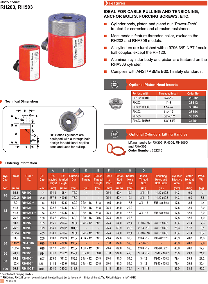 - Kích thủy lực rỗng tâm Power Team RH121T, con đội thủy lực rỗng tâm Power Team RH121T, Power Team hole hydraulic jack RH121T: là loại kích thủy lực, con đội thủy lực. Rỗng tâm, 1 chiều, vỏ thép, có sức đẩy max: 12 tấn, hành trình max: 41.3 mm, lỗ rỗng tâm: 17.5 mm, chuyên dùng kéo rút trong công nghiệp.