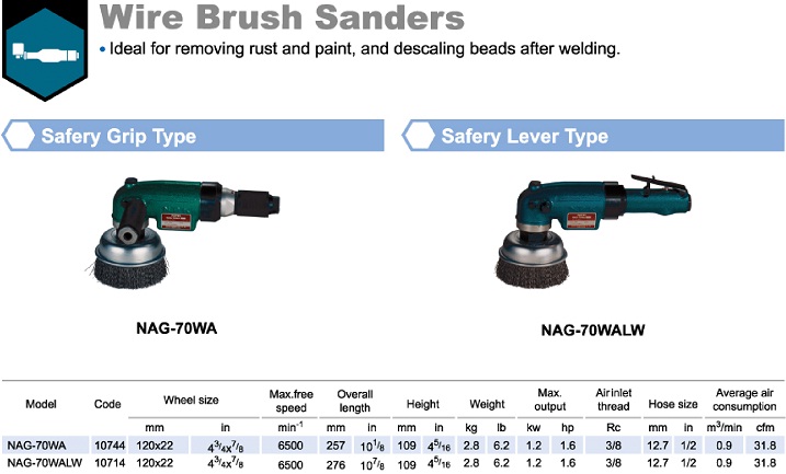 - Máy chà nhám khí nén NPK NAG-70WALW, NPK air sanders NAG-70WALW: là loại máy đánh bóng, công suất: 1.2 kW, sử dụng đĩa chà nhám đường kính max: 120 x 22 mm, tốc độ vòng quay trục chính max: 6.500 vòng/phút (khi không tải), để đánh bóng những bề mặt vật liệu có kích thước, bề mặt rộng lớn, nhiều bavia, được sử dụng chủ yếu trong các xưởng cơ khí, kết cấu thép.