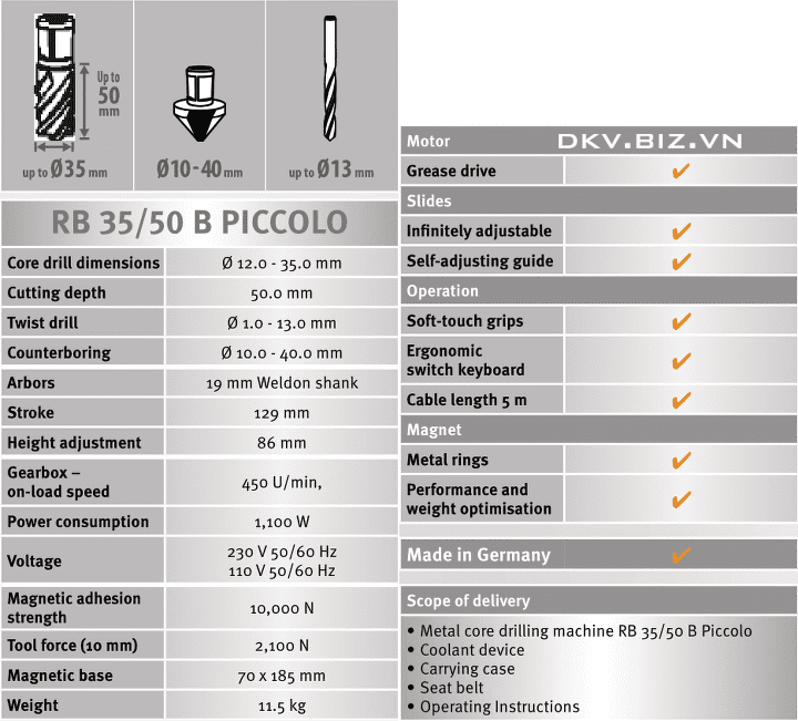 - Bộ máy khoan từ Alfra RB 35/50 B Piccolo gồm máy khoan từ RB 35/50 B Piccolo, dây đeo an toàn, bình chứa dầu cắt gọt, sách hướng dẫn sử dụng, đặt toàn bộ trong hộp nhựa công nghiệp. Trọng lượng: 10.6 kg.