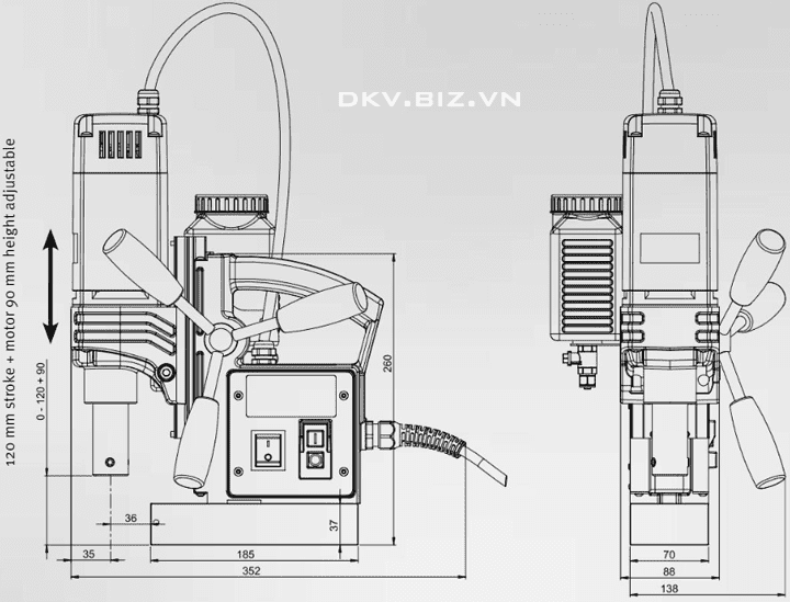 - Máy khoan từ Alfra RB 35/50 B Piccolo sử dụng động cơ điện: 1.1 kW/230V/50Hz/1ph, bảo vệ quá tải, 1 cấp tốc độ, vô cấp với tốc độ động cơ 450 vòng/phút. Chiều dài dây phích cắm điện: 5 m.