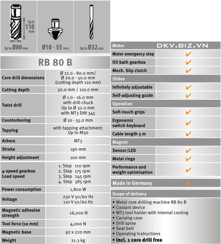 - Máy khoan từ Alfra RB 80 B, Alfra magnetic drilling machines RB 80 B chuyên dùng để khoan thép tấm, dầm thép với đường kính khoan từ: Ø 12 ÷ 80 mm (chiều sâu cắt 50 mm), Ø 20 - 50 mm (chiều sâu cắt 110 mm), khoan xoắn: Ø1 ÷ 32 mm, ta rô: M30, vát mép: Ø10 ÷ 55 mm, chiều sâu khoan max: 50 - 110 mm.