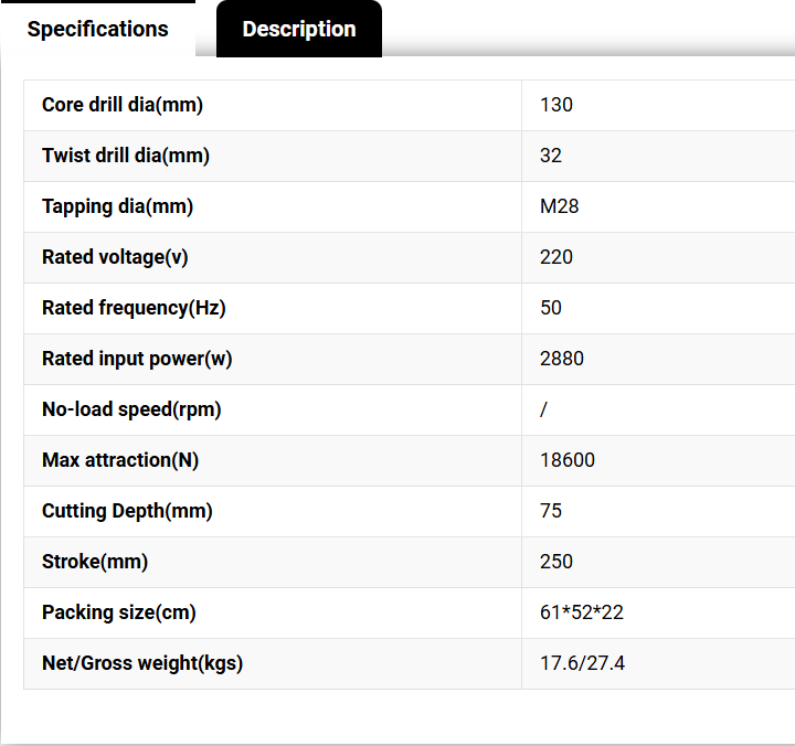 - Máy khoan từ Cayken KCY-130/3WDO, Cayken magnetic drilling machines KCY-130/3WDO: chuyên dùng để khoan thép tấm, dầm thép với đường kính khoan từ max: Ø 130 mm (cho cả mũi khoan thép gió và mũi khoan gắn hợp kim), mũi khoan xoắn max: Ø 32 mm, ta rô max: M28, chiều sâu khoan max: 75 mm.