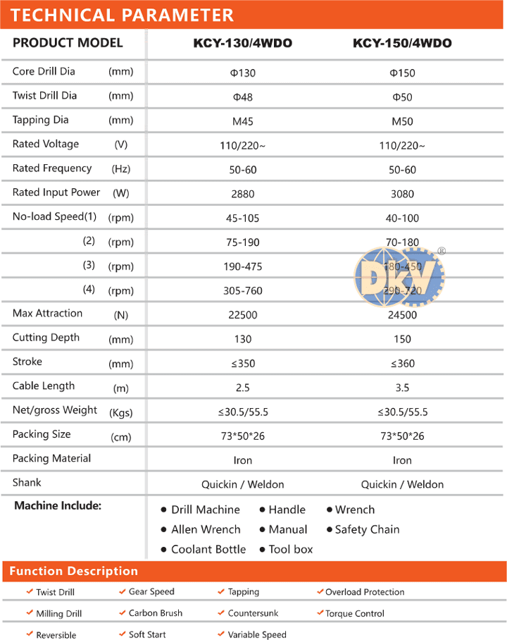 - Máy khoan từ Cayken KCY-150/4WDO, Cayken magnetic drilling machines KCY-150/4WDO: chuyên dùng để khoan thép tấm, dầm thép với đường kính khoan từ max: Ø 150 mm (cho cả mũi khoan thép gió và mũi khoan gắn hợp kim), mũi khoan xoắn, doa max: Ø 57 mm, ta rô max: M50, chiều sâu khoan max: 150 mm.