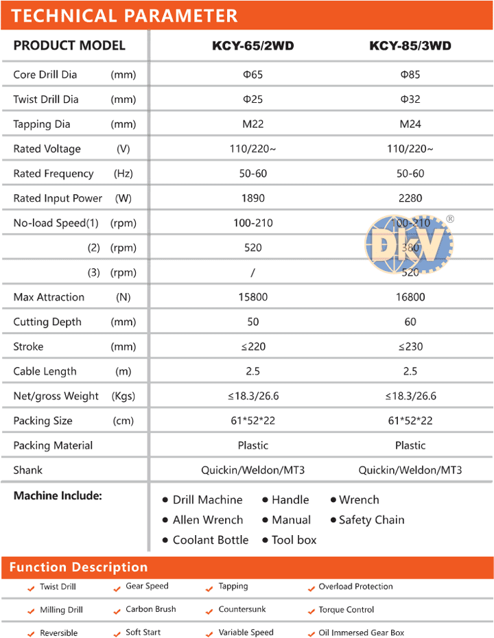 - Máy khoan từ Cayken KCY-85/3WD, Cayken magnetic drilling machines KCY-85/3WD: chuyên dùng để khoan thép tấm, dầm thép với đường kính khoan từ max: Ø 95 mm (cho cả mũi khoan thép gió và mũi khoan gắn hợp kim), mũi khoan xoắn max: Ø 32 mm, ta rô max: M24, chiều sâu khoan max: 60 mm.