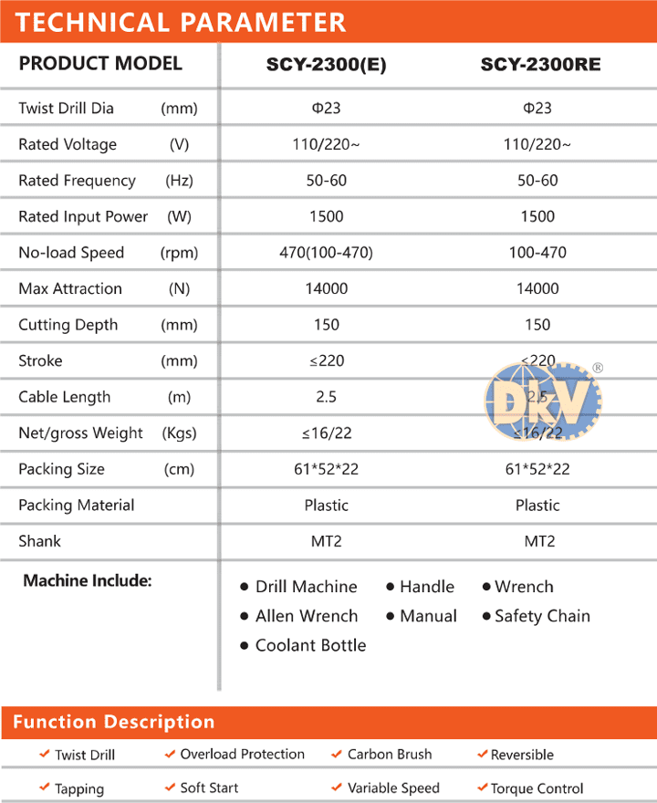 - Máy khoan từ Cayken SCY-2300 sử dụng động cơ điện: 1.5 kW/230V/50Hz/1ph, khởi động mềm, trang bị ngắt quá tải, 1 cấp tốc độ, với tốc độ động cơ 100 - 470 vòng/phút. Trên thân máy, trang bị núm vặn để thay đổi tốc độ trục chính cũng như lực cắt mũi khoan. Ngoài ra có thêm nút đảo chiều quay trục chính (chức năng ta rô ren). Chiều dài dây phích cắm điện: 2.5 m.