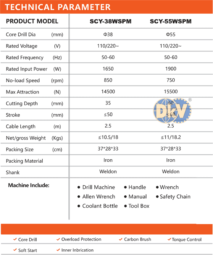 - Máy khoan từ Cayken SCY-38WSPM, Cayken magnetic drilling machines SCY-38WSPM: chuyên dùng để khoan thép tấm, dầm thép có biên dạng cong hoặc tròn, với đường kính khoan từ max: Ø 38 mm (mũi khoan thép gió và mũi khoan hợp kim), chiều sâu khoan max: 35 mm.