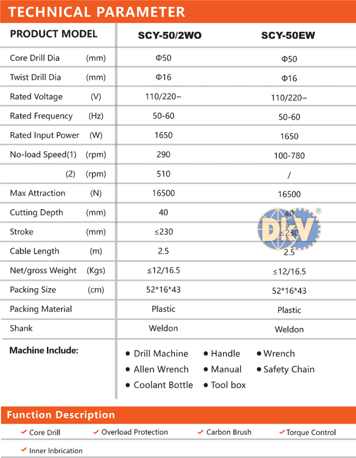 - Máy khoan từ Cayken SCY-50/2WO sử dụng động cơ điện: 1.65 kW/230V/50Hz/1ph, tự ngắt khi quá tải, 2 cấp tốc độ, với tốc độ động cơ max: 290 vòng/phút (cấp số 1) và max: 510 vòng/phút (cấp số 2). Chiều dài dây phích cắm điện: 2.5 m.