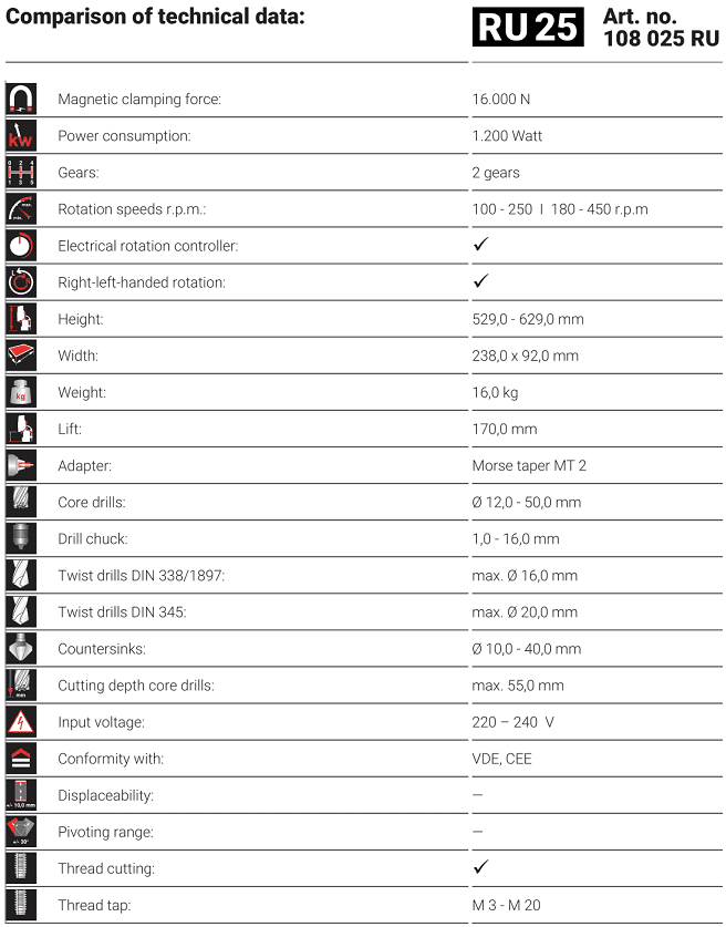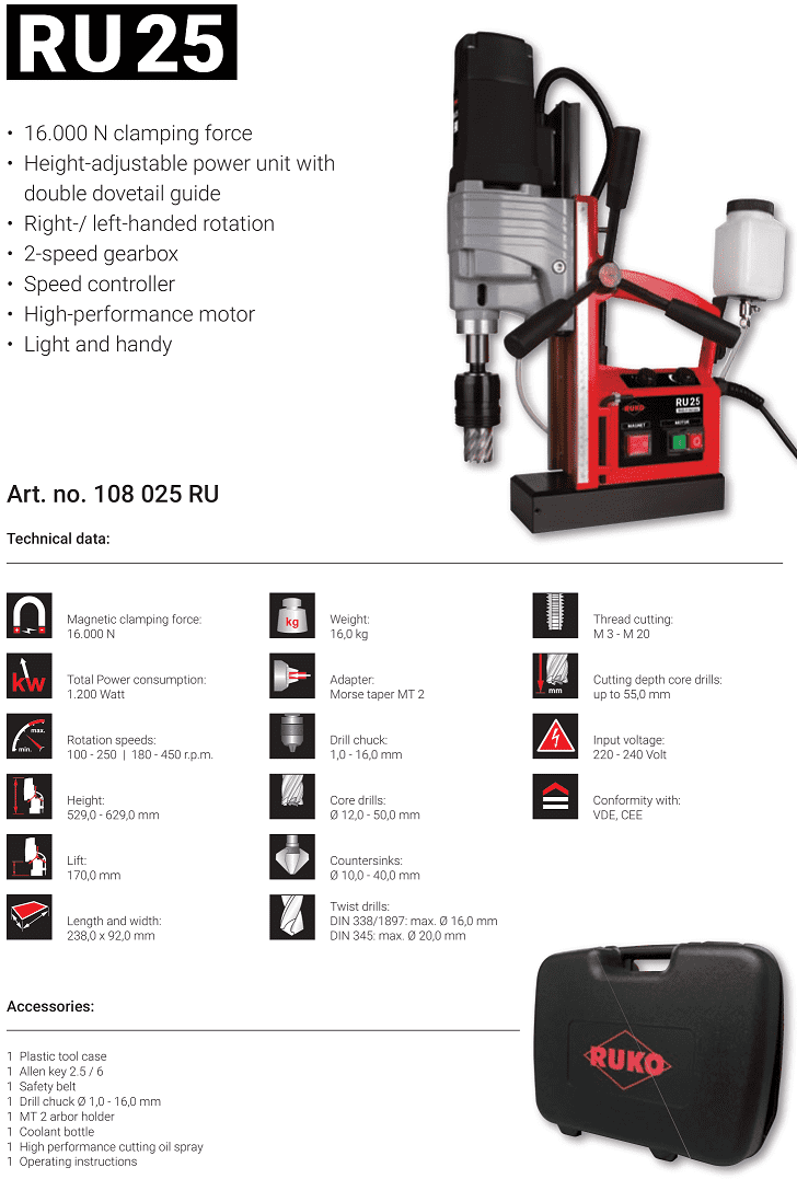 - Máy khoan từ Ruko RU25, Ruko magnetic drilling machines RU25 chuyên dùng để khoan thép tấm, dầm thép với đường kính khoan từ: Ø 12 ÷ 50 mm (cho cả mũi khoan thép gió và mũi khoan gắn hợp kim), khoan xoắn max: (DIN338/1897: 16 mm | DIN345: 20 mm), vát mép Ø 10 - 40 mm, ta rô ren M3 - M20, chiều sâu khoan max: 55 mm.