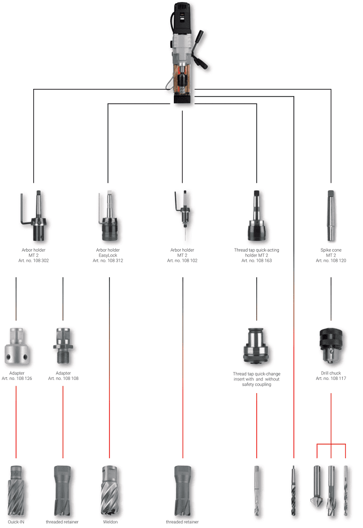 - Chuôi kẹp (lỗ côn trục chính) của máy khoan từ Ruko RU25 sử dụng loại tiêu chuẩn 3/4 in weldon ( MT 2) cho phép kẹp nhanh nhiều loại khoan từ có đường kính khác nhau với cùng kiểu chuôi kẹp MT 2. Bầu kẹp mũi khoan xoắn cho phép kẹp các loại mũi khoan, mũi vát mép, mũi ta rô ren Ø 3 ÷ 16 mm.