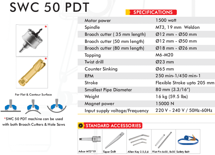 - Máy khoan từ Schifler SWC 50 PDT, Schifler magnetic drilling machines SWC 50 PDT chuyên dùng để khoan thép tấm, dầm thép có biên dạng cong hoặc tròn (> 80 mm) với đường kính khoan từ max: Ø 50 mm (cho cả mũi khoan thép gió và mũi khoan gắn hợp kim), đường kính max: Ø 23 mm (đối với mũi khoan xoắn), vát mép max: Ø 65 mm, ta rô ren M6 - M20, chiều sâu khoan max: 80 mm.