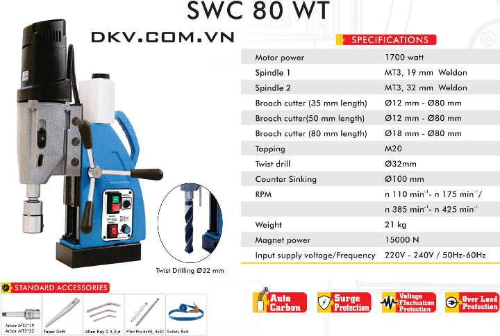 - Máy khoan từ Schifler SWC 80 WT, Schifler magnetic drilling machines SWC 80 WT chuyên dùng để khoan thép tấm, dầm thép với đường kính khoan từ max: Ø 80 mm (cho cả mũi khoan thép gió và mũi khoan gắn hợp kim), đường kính max: Ø 32 mm (đối với mũi khoan xoắn), ta rô max: M30, vát mép max: Ø 100 mm, chiều sâu khoan max: 80 mm.