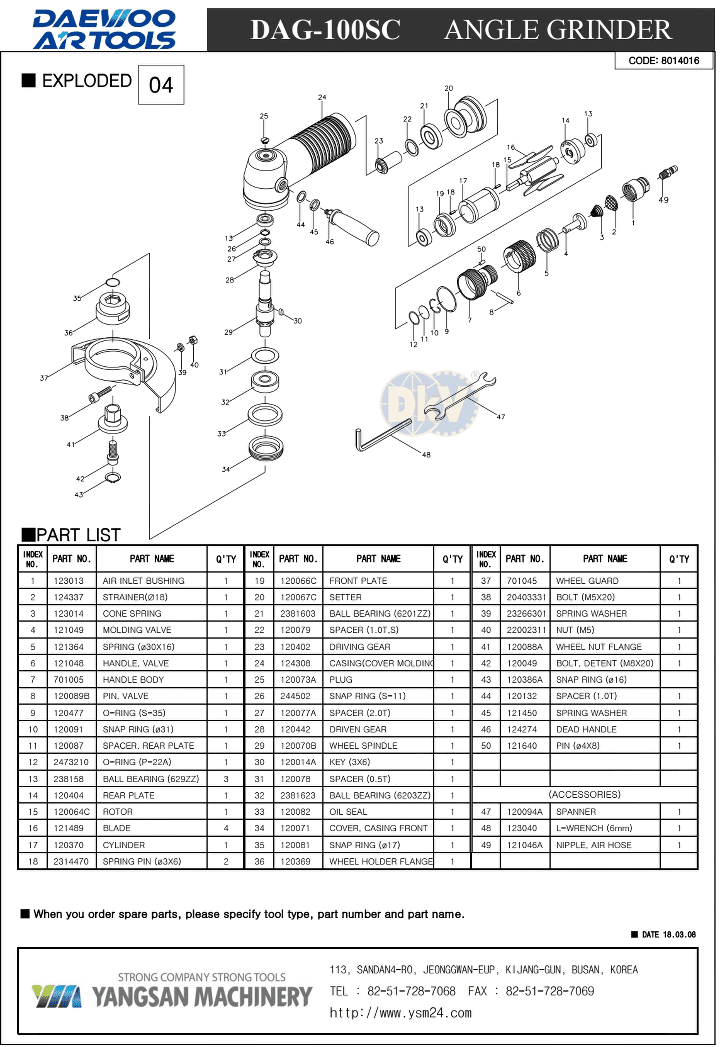 - Máy mài góc khí nén Daewoo DAG-100SC được sản xuất bởi nhà sản xuất Yangsan Machinery - Busan - Hàn Quốc. Made in Korea (CO Phòng thương mại Hàn Quốc).