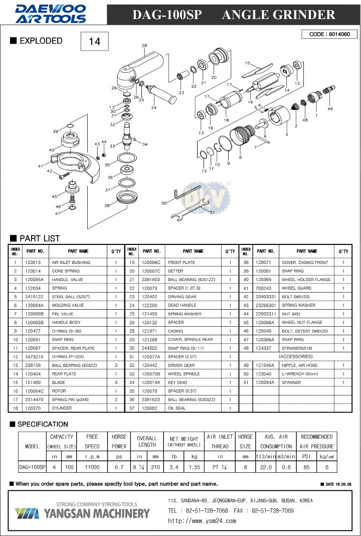 - Máy mài góc khí nén Daewoo DAG-100SP được sản xuất bởi nhà sản xuất Yangsan Machinery - Busan - Hàn Quốc. Made in Korea (CO Phòng thương mại Hàn Quốc).
