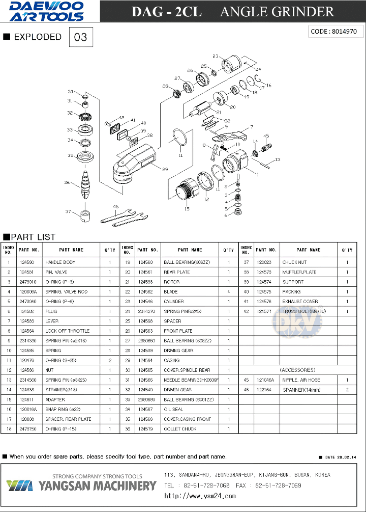 - Máy mài góc khí nén Daewoo DAG-2CL được sản xuất bởi nhà sản xuất Yangsan Machinery - Busan - Hàn Quốc. Made in Korea (CO Phòng thương mại Hàn Quốc).