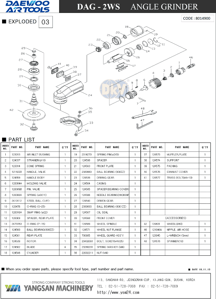 - Máy mài góc khí nén Daewoo DAG-2WS được sản xuất bởi nhà sản xuất Yangsan Machinery - Busan - Hàn Quốc. Made in Korea (CO Phòng thương mại Hàn Quốc).