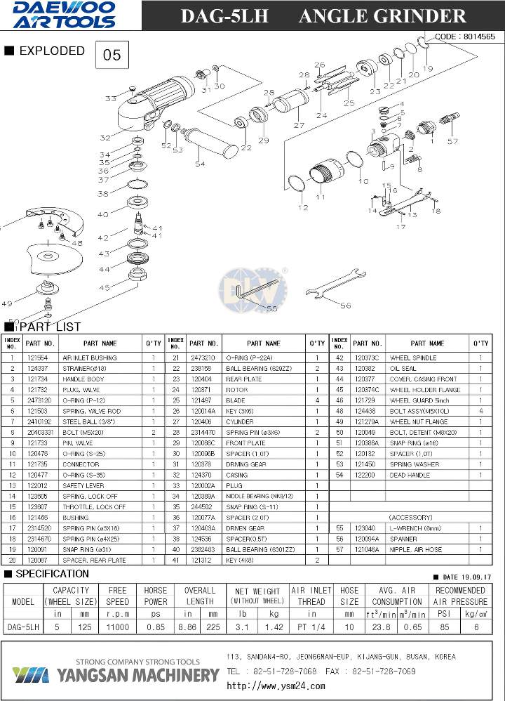 - Máy mài góc khí nén Daewoo DAG-5LH được sản xuất bởi nhà sản xuất Yangsan Machinery - Busan - Hàn Quốc. Made in Korea (CO Phòng thương mại Hàn Quốc).