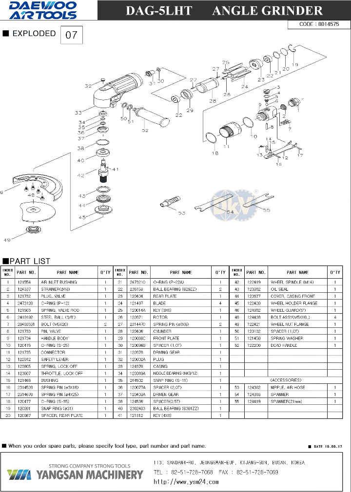 - Máy mài góc khí nén Daewoo DAG-5LHT được sản xuất bởi nhà sản xuất Yangsan Machinery - Busan - Hàn Quốc. Made in Korea (CO Phòng thương mại Hàn Quốc).