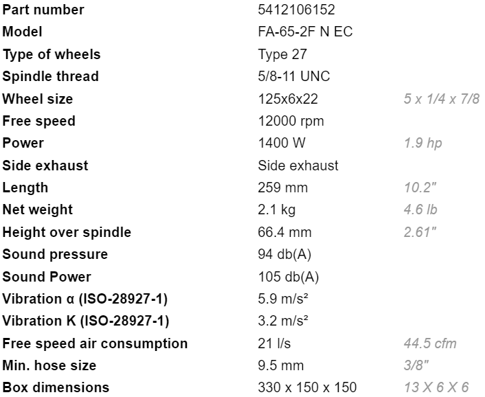 - Lượng khí tiêu thụ của máy mài góc khí nén Fuji A-65-2F N EC: 21 l/s, size kết nối nguồn khí nén: 3/8 ".
