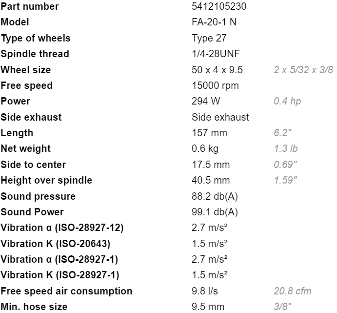 - Lượng khí tiêu thụ của máy mài góc khí nén Fuji FA-20-1 N: 9.8 l/s, size kết nối nguồn khí nén: 3/8 ".