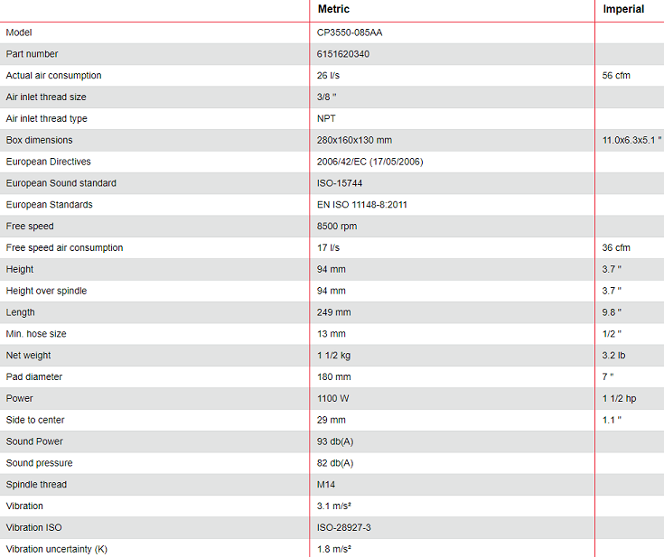 - Máy chà nhám khí nén Chicago Pneumatic CP3550-085AA có tốc độ không tải: 8.500 rpm, tốc độ tiêu thụ không khí 17 l/s.