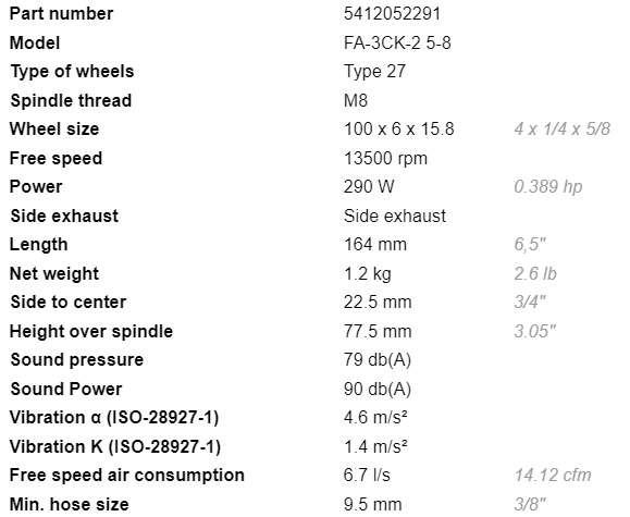 - Máy mài góc khí nén Fuji FA-3CK-2-5-8 có đường kính đĩa (đá mài) max: Ø 100 mm, kích thước 100 x 6 x 15.8 mm, công suất: 290 W, tốc độ không tải: 13.500 rpm.