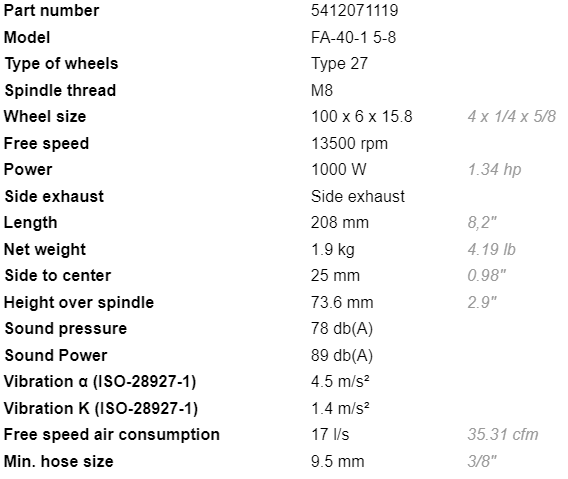 - Lượng khí tiêu thụ của máy mài góc khí nén Fuji FA-40-1-5-8: 17 l/s, size kết nối nguồn khí nén: 3/8 ".