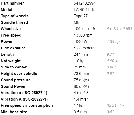 - Máy mài góc khí nén Fuji FA-40-1F 15 có đường kính đĩa (đá mài) max: Ø 100 mm, kích thước 100 x 6 x 15 mm, công suất: 1.000 W, tốc độ không tải: 13.500 rpm.
