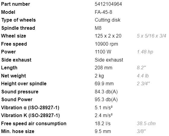 - Lượng khí tiêu thụ của máy mài góc khí nén Fuji FA-45-8: 18.2 l/s, size kết nối nguồn khí nén: 3/8 ".