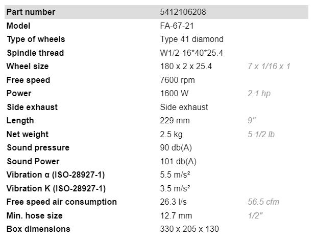 - Máy mài góc khí nén Fuji FA-67-21 có đường kính đĩa (đá mài) max: Ø 180 mm, kích thước 330 x 205 x 130 mm, công suất: 1.600 W, tốc độ không tải: 7.600 rpm.