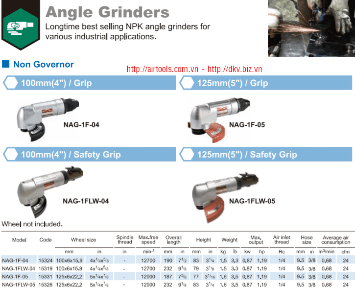 - Máy mài thẳng khí nén NPK NAG-1FLW-04, NPK air straight grinder NAG-1FLW-04: là loại máy mài thẳng, có công suất max: 0.87 kW, sử dụng đĩa mài đường kính max: 100 x 6 x 15.9 mm, tốc độ vòng quay trục chính max: 12700 vòng/phút (khi không tải), để mài, cắt, đánh bóng những vật liệu có kích thước, bề mặt rộng lớn, nhiều bavia, được sử dụng chủ yếu trong các xưởng cơ khí, kết cấu thép.