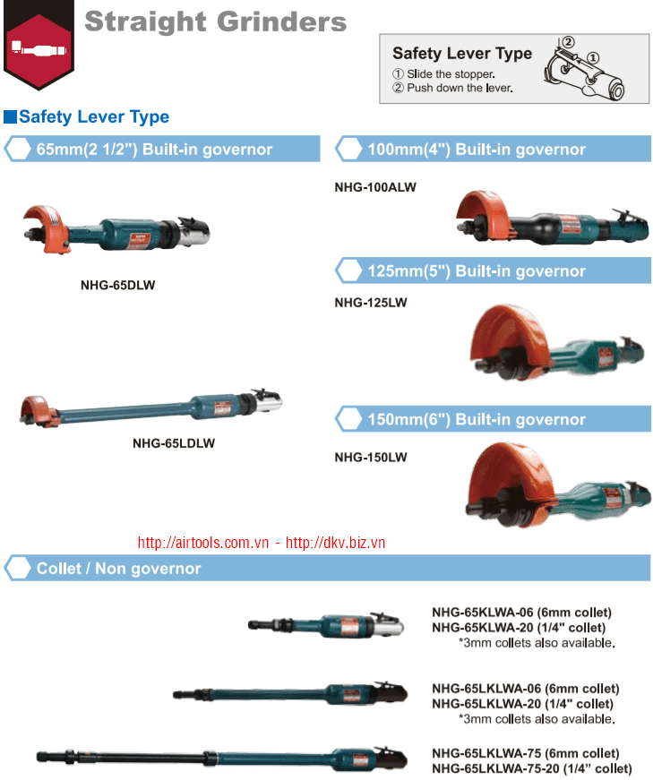- Máy mài thẳng khí nén NPK NHG-150LW, NPK air straight grinder NHG-150LW: là loại máy mài thẳng, có công suất max: 1.32 kW, sử dụng đĩa mài đường kính max: 150 x 25 x 15.9 mm, tốc độ vòng quay trục chính max: 6200 vòng/phút (khi không tải), để mài, cắt, đánh bóng những vật liệu có kích thước, bề mặt rộng lớn, nhiều bavia, được sử dụng chủ yếu trong các xưởng cơ khí, kết cấu thép.