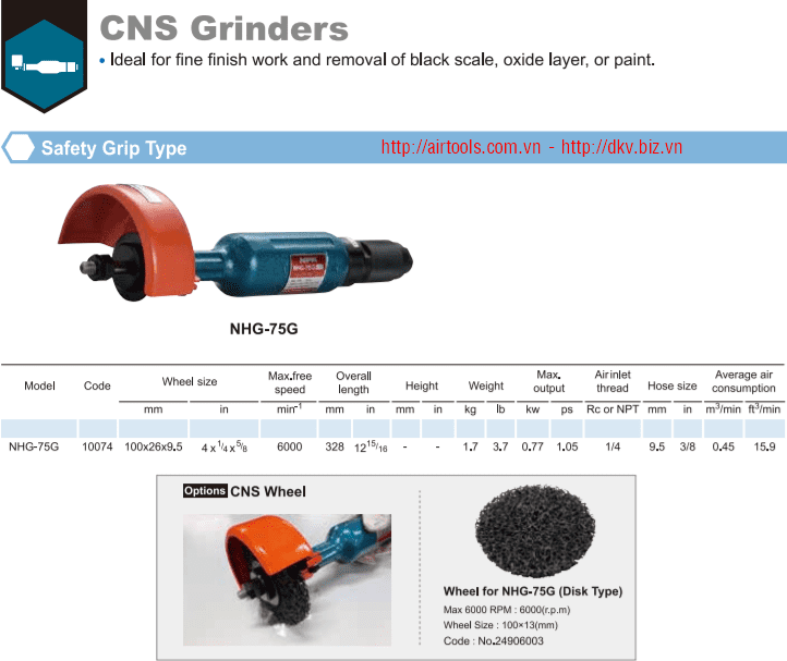 - Máy mài thẳng khí nén NPK NHG-65G được sản xuất bởi nhà sản xuất Nippon Pneumatic Kogyo - Osaka - Japan. Made in Japan (CO Phòng thương mại Nhật Bản).