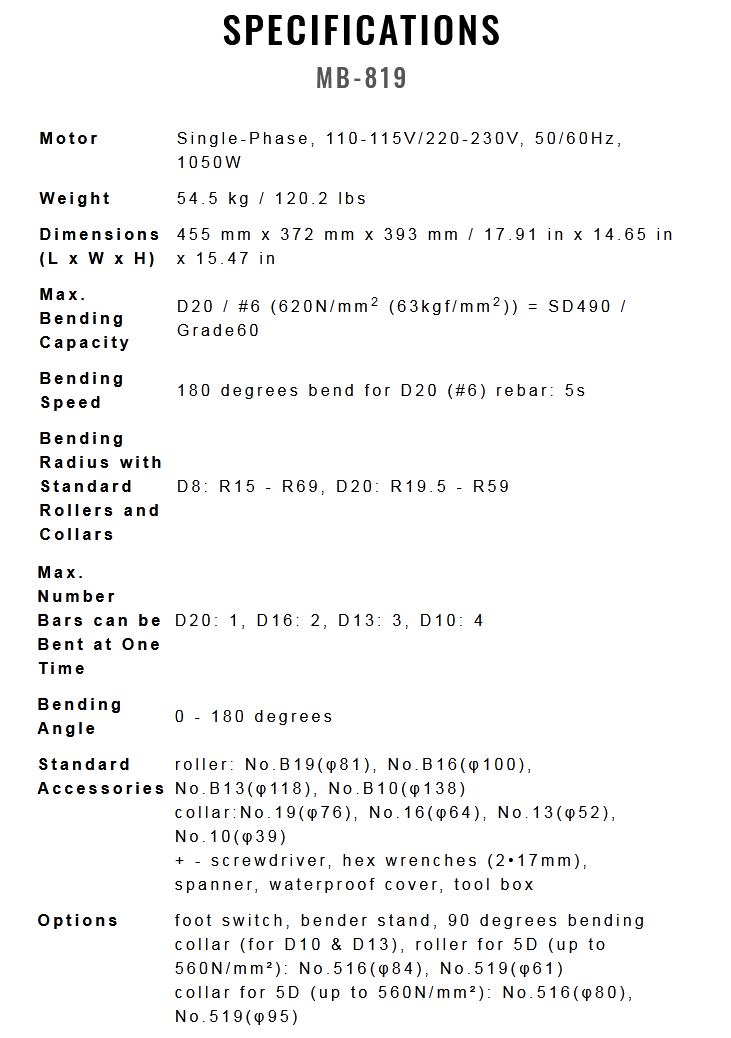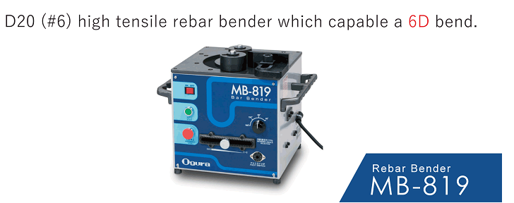 - Máy uốn thép thủy lực Ogura MB-819, Ogura Hydraulic Rebar Benders MB-819: là loại máy uốn thép thanh, cốt thép có lực uốn max: 620 N/mm2, khả năng uốn thép thanh size max: Ø 20 mm, chuyên được sử dụng trong ngành xây dựng, cơ khí, sản xuất sắt thép.