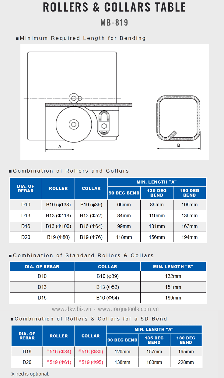 - Trang bị 4 trục lăn và vòng cổ tiêu chuẩn có đường kính lần lượt: No.B10, No.B13, No.B16, No.B19.