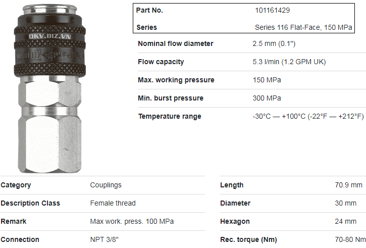 - Coupler thủy lực cao áp Cejn 101161429, Cejn female hydraulic high pressure 101161429: thuộc dạng khớp nối thủy lực nối nhanh (cắm/rút) đặc chủng, có dải áp hoạt động < 150 MPa (1.500 bar), chuyên sử dụng kết nối tạo áp cho tháo/lắp các mối ghép chặt không ren, căng bulong thủy lực và thiết bị thủy lực cao áp khác.