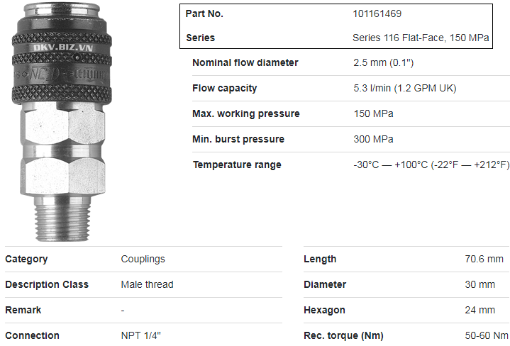 - Coupler thủy lực cao áp Cejn 101161469, Cejn female hydraulic high pressure 101161469: thuộc dạng khớp nối thủy lực nối nhanh (cắm/rút) đặc chủng, có dải áp hoạt động < 150 MPa (1.500 bar), chuyên sử dụng kết nối tạo áp cho tháo/lắp các mối ghép chặt không ren, căng bulong thủy lực và thiết bị thủy lực cao áp khác.