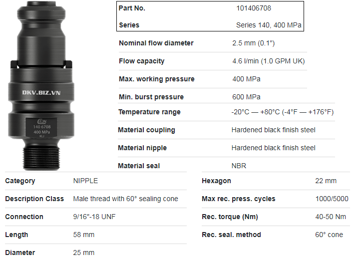 - Vật liệu chế tạo coupler thủy lực cao áp Cejn 101406708 là thép hợp kim phủ mạ đen, vòng đệm là NBR (cao su kháng dầu), cho phép đạt giới hạn nổ max: 600 MPa (6.000 bar).