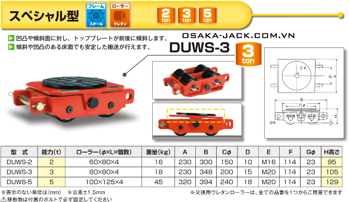 - Rùa lăn Daiki DUWS-5, Rùa lăn chuyển hàng Daiki DUWS-5, Daiki rollers DUWS-5: là thiết bị dịch chuyển tải trọng chất lượng cao của hãng Daiki/Japan. Rùa lăn Daiki DUWS-5 có khả năng chịu tải max: 5 tấn, chiều cao (H): 128 mm, 2 trục với 4 con lăn chịu tải.