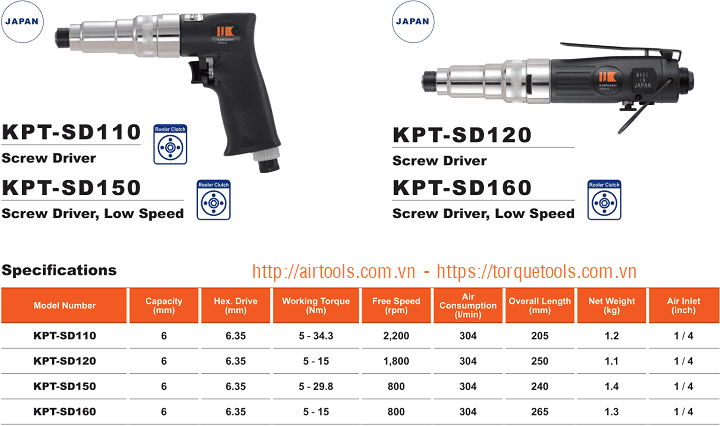 - Súng siết vít khí nén Kawasaki KPT-SD160, Kawasaki air impact driver KPT-SD160: chuyên dùng để siết (bắn) các loại vít ≤ 6 mm trong công nghiệp, với lực siết khả dụng: 5-15 N.m, cỡ đầu kẹp vít: tiêu chuẩn lục giác hex.1/4" (hex 6.35 mm), tốc độ vòng quay trục chính max: 800 vòng/phút (khi không tải).