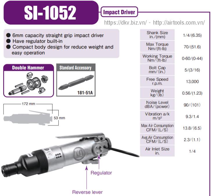 - Súng bắn vít khí nén Shinano SI-1502 có kích thước: 172x53 mm, trọng lượng: 0.56 kg.