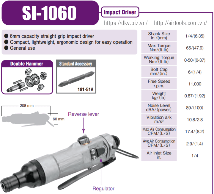 - Súng bắn vít khí nén Shinano SI-1060 có kích thước: 208x60 mm, trọng lượng: 0.87 kg.
