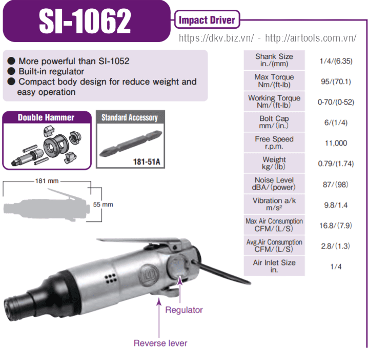 - Súng bắn vít khí nén Shinano SI-1062 có kích thước: 181x55 mm, trọng lượng: 0.79 kg.