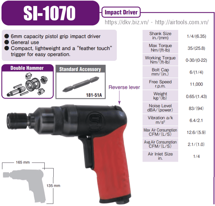 - Súng bắn vít khí nén Shinano SI-1070 có kích thước: 165x135 mm, trọng lượng: 0.65 kg.