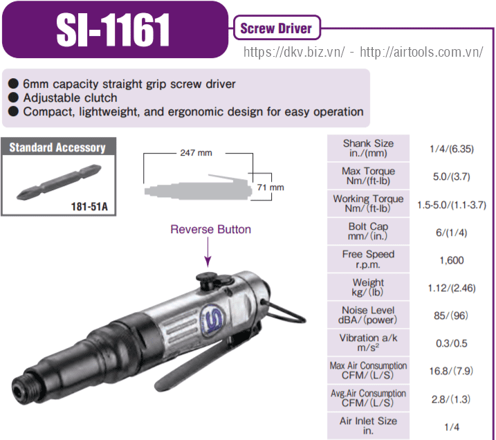 - Súng bắn vít khí nén Shinano SI-1161 có kích thước: 247x71 mm, trọng lượng: 1.12 kg.